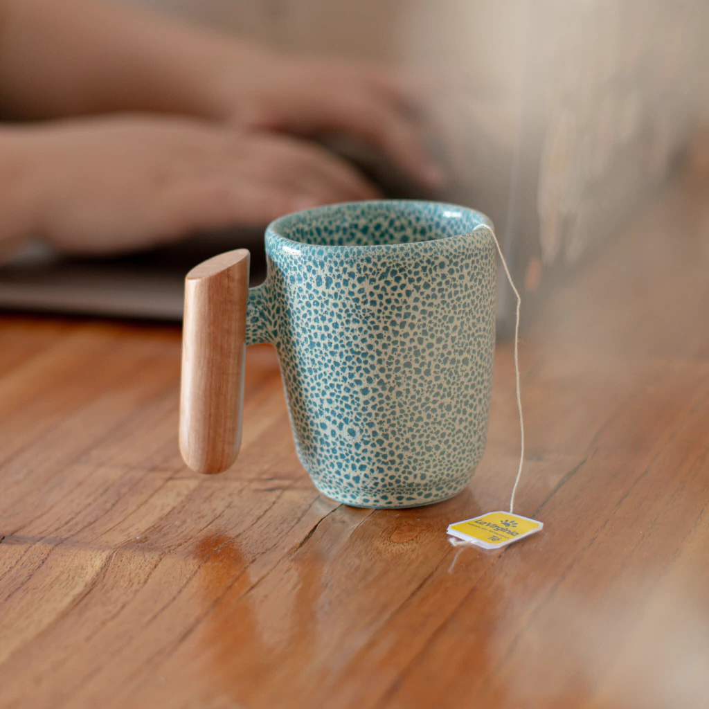 Taza de cerámica esmaltada con asa de madera protegida contra el agua con laca poliuretánica. Perfecta para quienes buscan una pieza única y funcional.